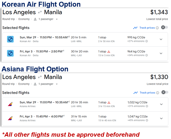 FLIGHT SCHEDULE: US Team Members will depart LAX Sunday Evening 3/29 and leave Manila Friday Late Evening 4/3